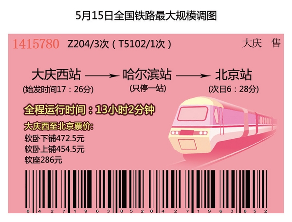 新的列车运行图将增开大庆西至北京方向Z204/3(T5102/1)次列车,这是大庆市首次开行的“Z”字头列车,由大庆西站始发,在大庆西至哈尔滨间运行车次为T5102/1次,全列软卧、软座,到北京全程运行13个小时,车票自4月16日起在大庆、大庆东、大庆西站同步发售。