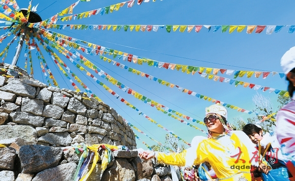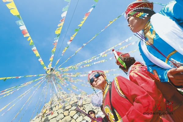 穿着民族盛装的哈萨尔后裔绕着敖包祈福。