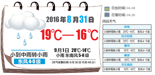 31日大庆风雨继续最低气温16℃ 未来三天气温整体偏低