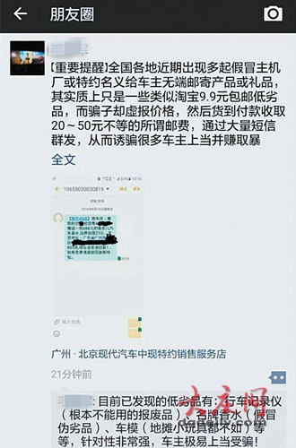 提醒的大致内容为:全国各地近期出现多起假冒厂家或特约名义给车主无端邮寄产品或礼品,实质上只是一些类似网上9.9元包邮的低劣商品,而骗子却虚报价格,然后货到付款收取20-50元不等的邮费,通过大量群发短信,从而诱骗很多车主上当并赚取钱财。